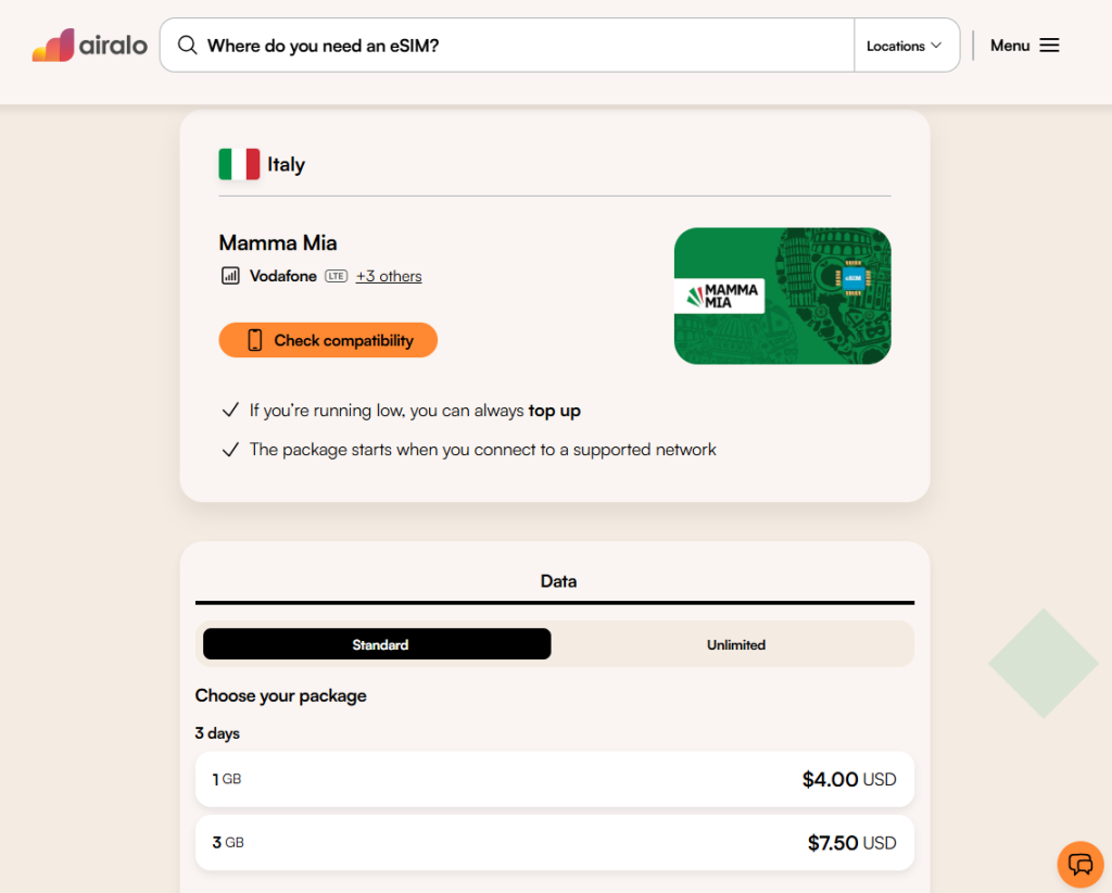 Airalo is a well-known global eSIM marketplace and offers an Italy-specific product they call “Mamma Mia” for Italy. Their presence in Italy is solid and they’re often cited in eSIM review round-ups.