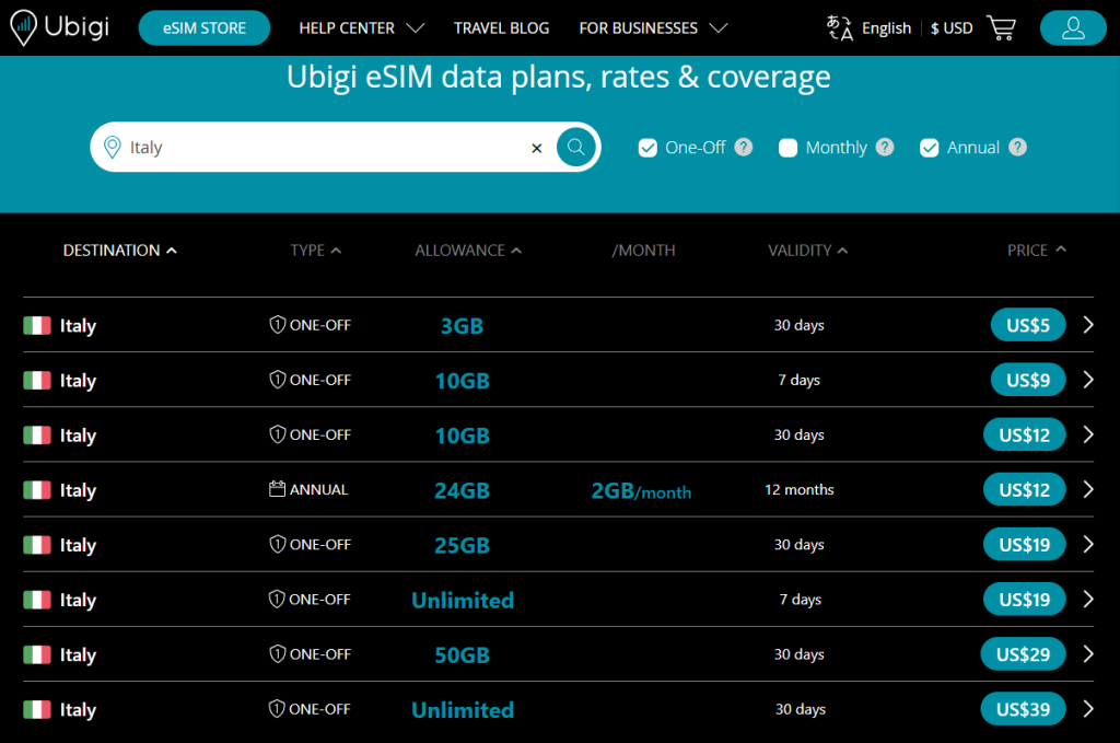 Ubigi is a global connectivity brand (part of NTT group) and offers eSIMs that support Italy among many destinations. Their strength lies in broader ecosystem flexibility and 5G support.