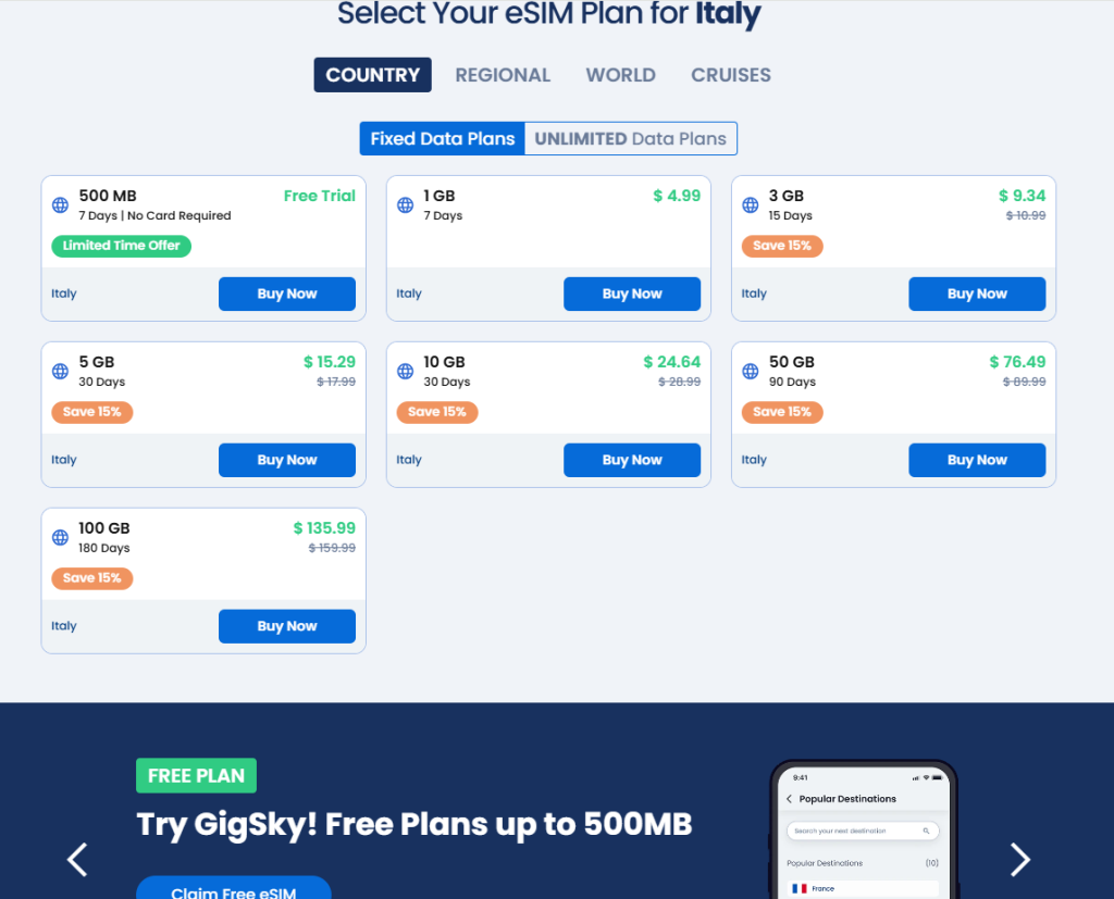 GigSky has been around for years and was one of the first global data eSIM brands integrated directly into devices like iPads. For Italy, GigSky provides regional Europe coverage with strong emphasis on roaming performance. I found GigSky especially appealing for travelers who move frequently between EU countries.