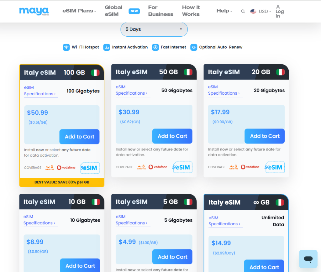 Maya’s Italy plans start around US $4.99 for 5 GB (5 days).