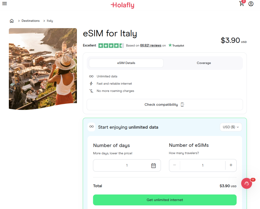 Holafly markets itself as a top unlimited-data eSIM for Italy and Europe. Their Italy-specific plan is featured prominently with “unlimited data” claims, instant digital delivery, and use of major Italian networks.