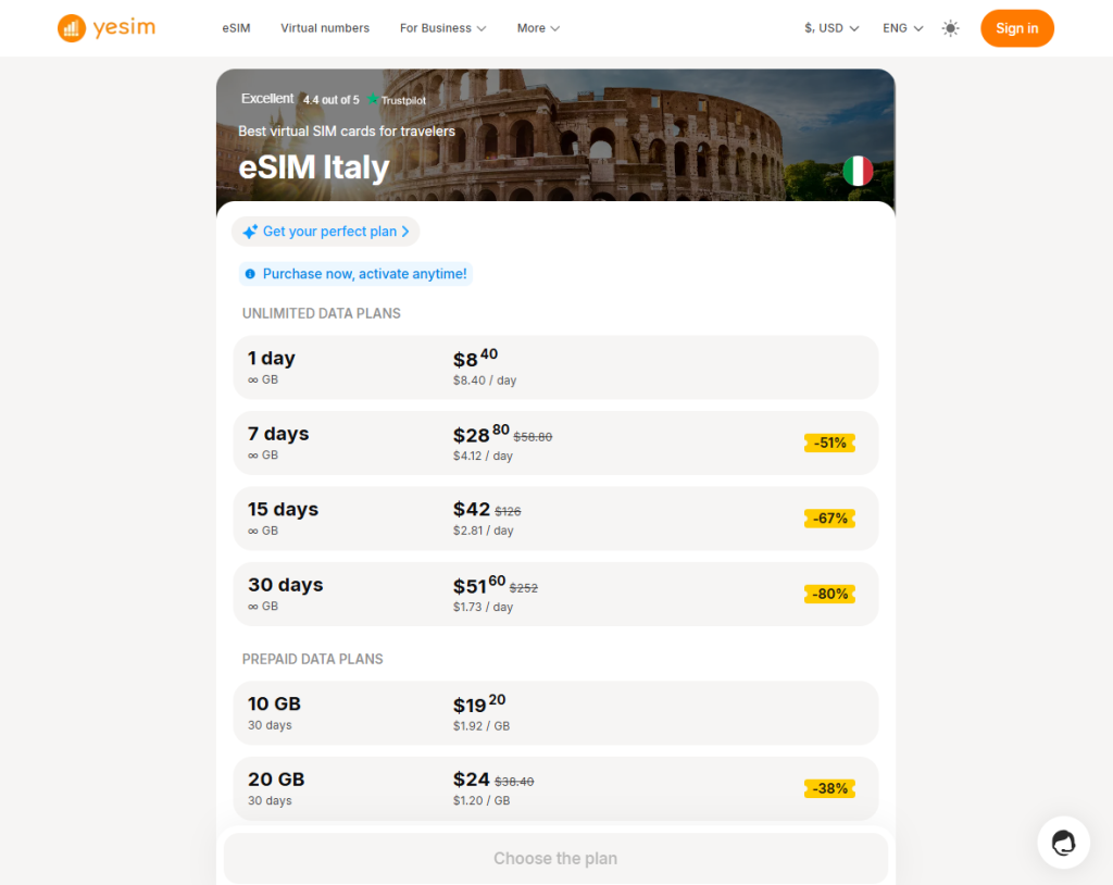 Yesim rounds out the list as another flexible, traveler-friendly eSIM option. Their app-based service provides access to Italy-only and Europe-wide plans, and setup is quick. I’ve tried Yesim on previous trips, and it performs reliably across urban Italy.