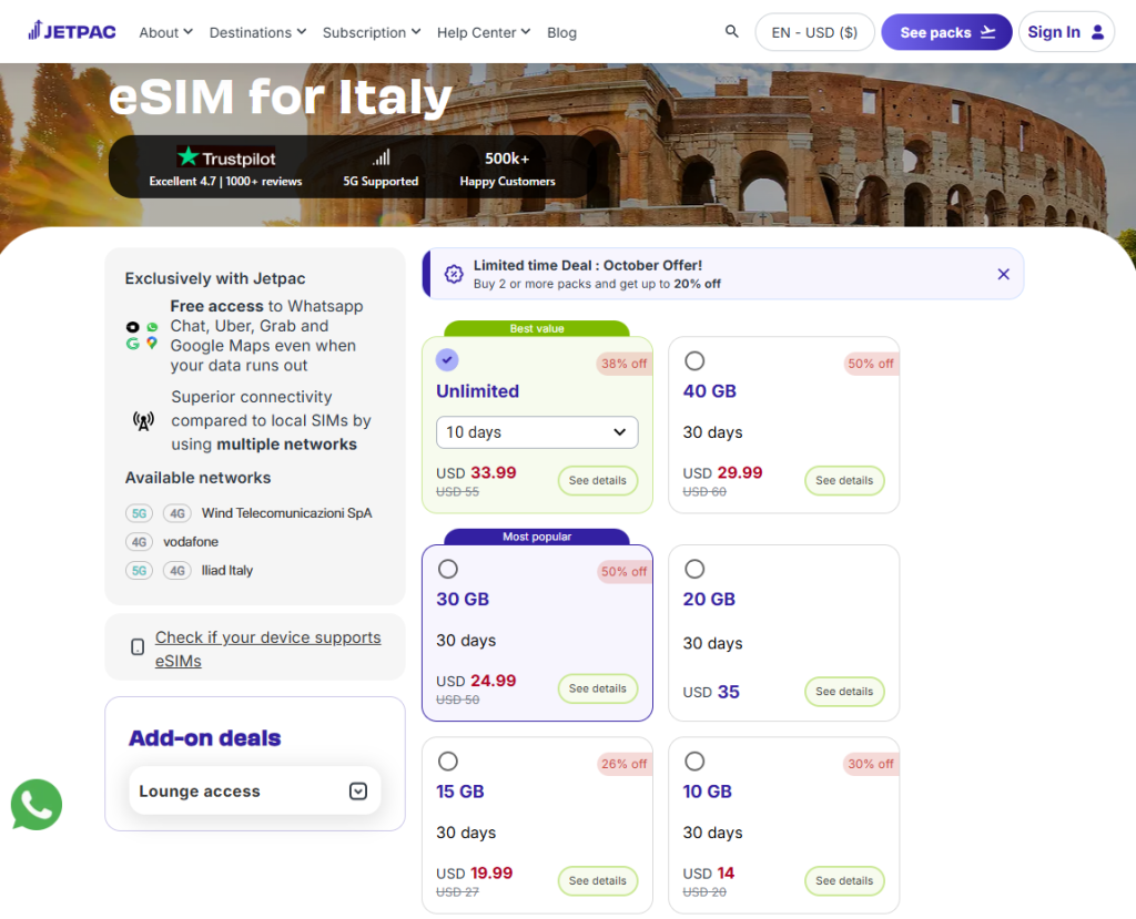 My verdict: For someone travelling to Italy for perhaps 1–3 weeks, expecting say 10–30 GB of usage and wants a budget-friendly plan, Jetpac sits nicely as a 5th option.