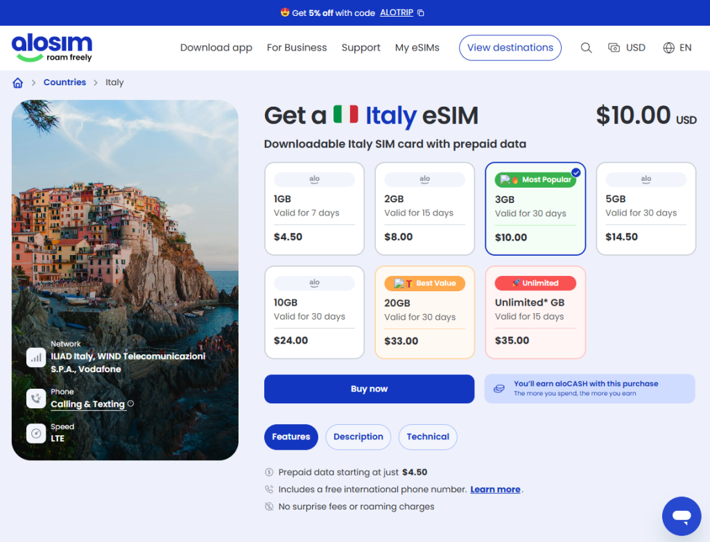 Alosim is a smaller but fast-growing provider offering competitive local eSIM options in Italy. I’ve noticed that they emphasize affordability and simplicity, with country-specific plans that are easy to purchase directly from their website or app.