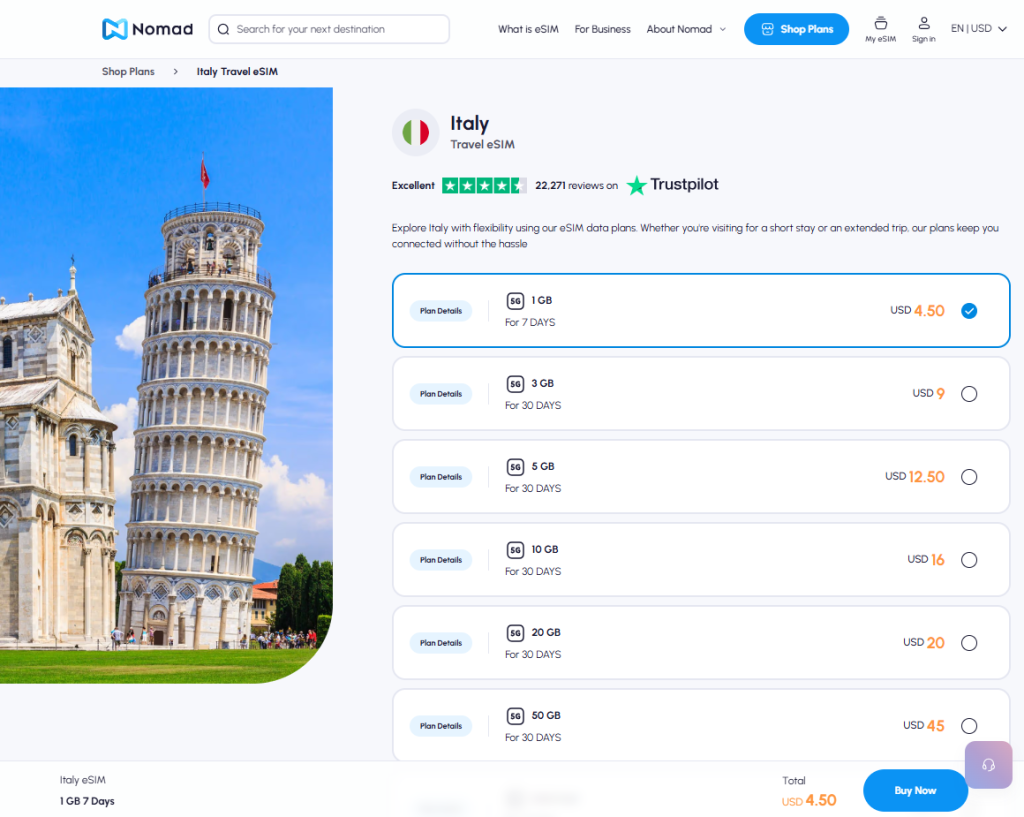 Nomad has become increasingly popular among frequent travelers because of its wide selection of country-specific and regional eSIMs. Their Italy plans are offered under both Europe and Italy-only categories. Nomad uses well-established networks such as Vodafone and TIM in Italy, which means stable coverage across major cities and tourist regions.